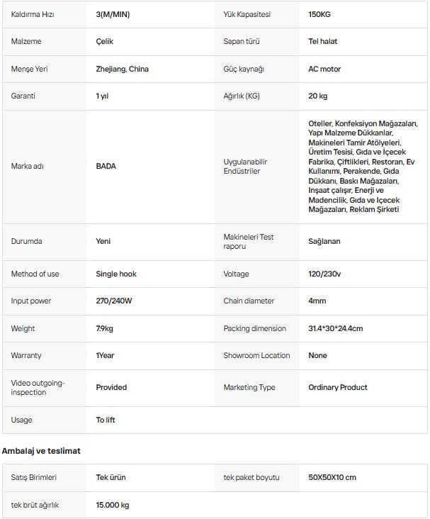 BADA BDH150 150 Kg 3 Metre Elektrikli Caraskal
