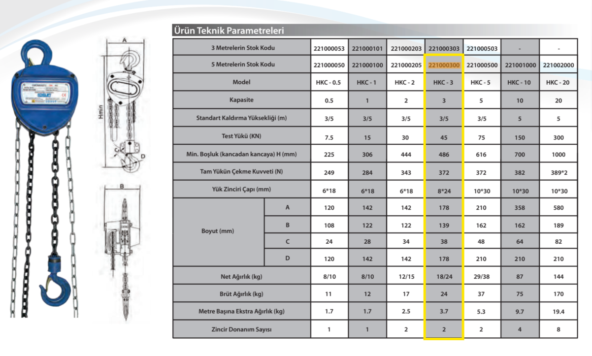 3 ton taşıma kapasitesi sayesinde ağır sanayi uygulamalarında güvenle kullanılabilir. 5 metre zincir uzunluğu, yüksek noktalarda ve derin alanlarda esnek çalışma imkânı sunar. HS-S tipi üçgen gövde, yük altında ekstra denge ve uzun ömürlü performans sağlar.