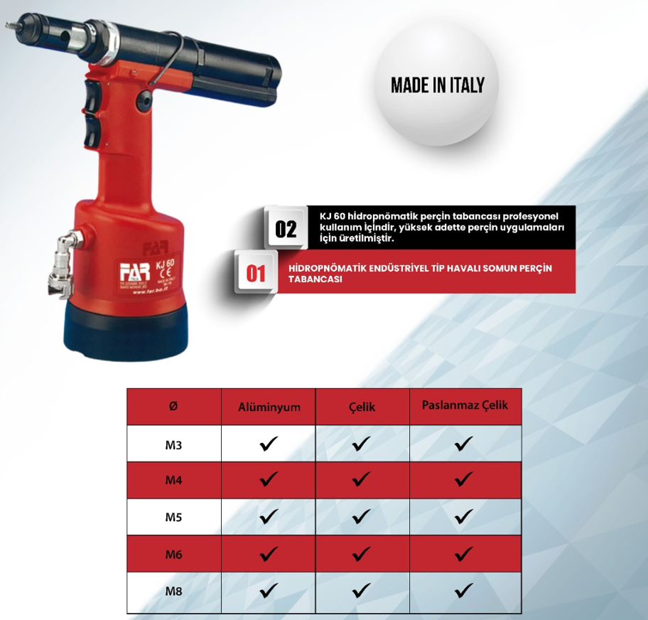 Otomotiv, metal imalat, montaj hatları, bakım-onarım ve sanayi uygulamalarında güvenilir bir çözüm sunan FAR KJ60, uzun ömürlü performansı ile profesyonellerin tercih ettiği somun perçin tabancaları arasında yer alır.
