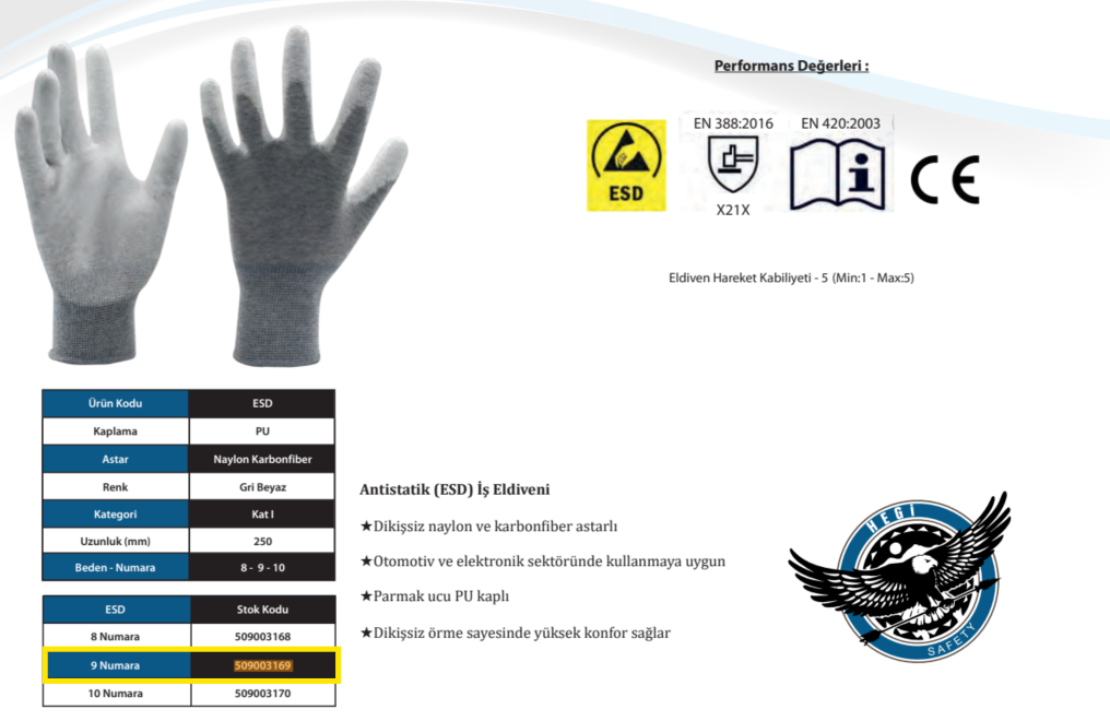 HEGI Safety ESD parmak ucu PU kaplı polyester antistatik eldiven No:9, elektronik üretim, hassas montaj ve statik elektriğe duyarlı çalışma alanları için tasarlanmış profesyonel bir iş güvenliği eldivenidir. Antistatik özelliği sayesinde statik elektrik oluşumunu engelleyerek elektronik bileşenlerin zarar görmesini önler.