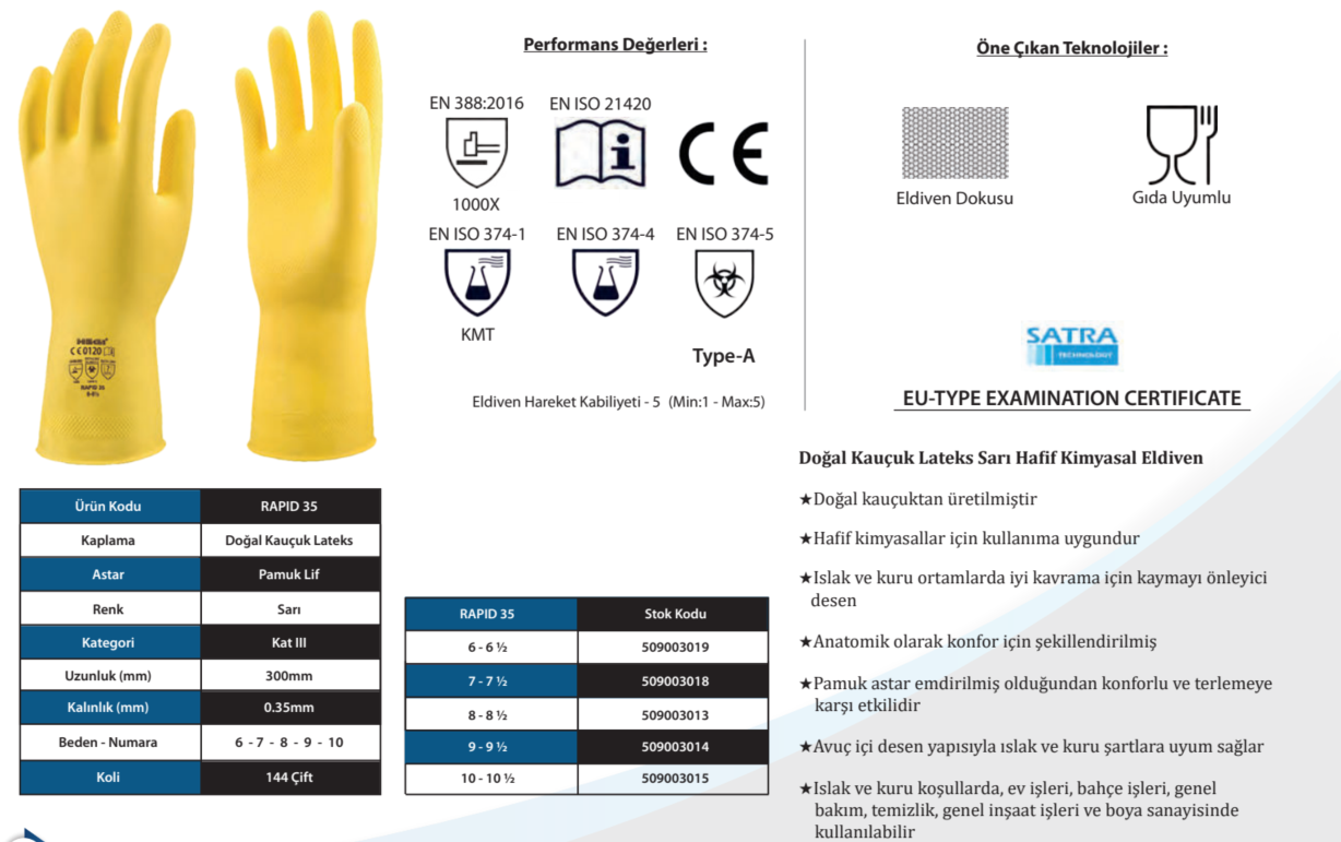 Hegi Rapid 35 Lateks Eldiven, laboratuvar, temizlik ve sanayi uygulamalarında elleri güvenle korur. Esnek lateks yapısı, rahat kullanım ve yüksek dokunma hassasiyeti sağlar.