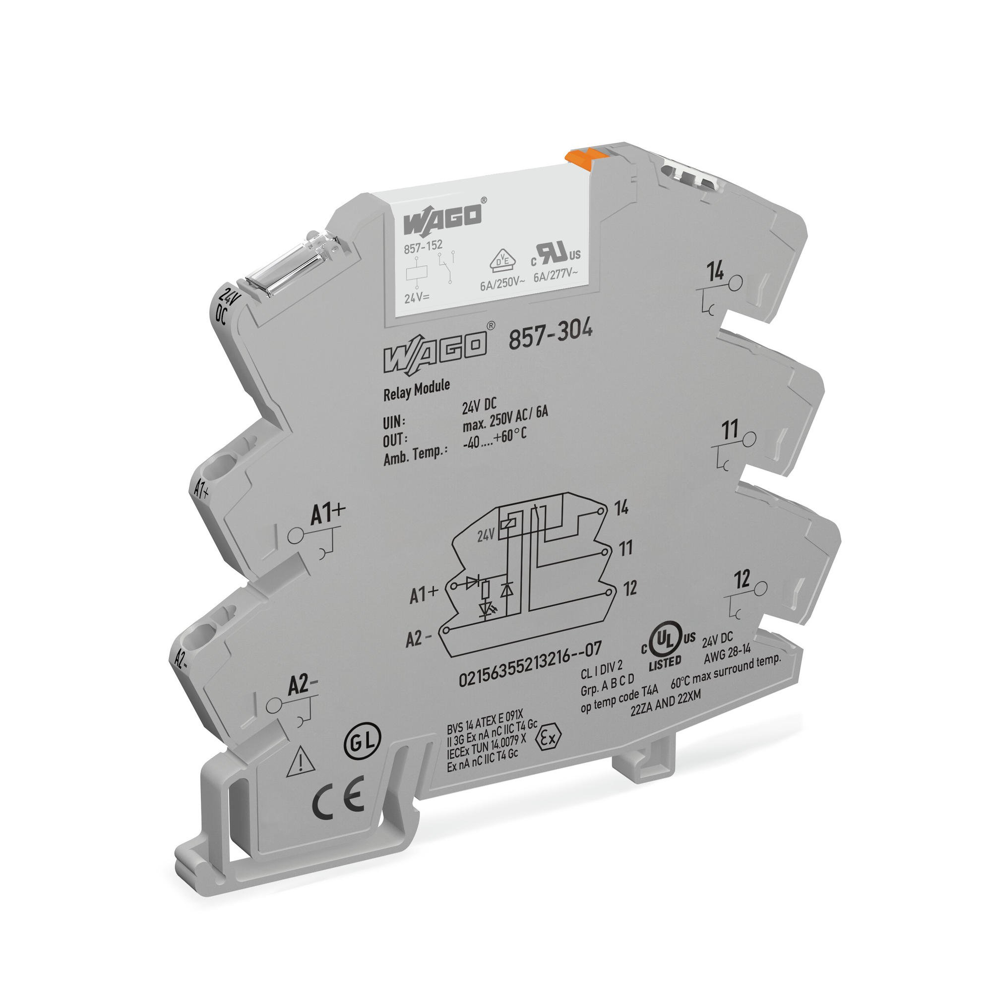WAGO 857-304 Röle Modülü; Nominal Giriş Gerilimi 24 VDC; 1 Değişken Kontak; Sınırlayıcı Sürekli Akım: 6 A; 2,50 mm²; Gri
